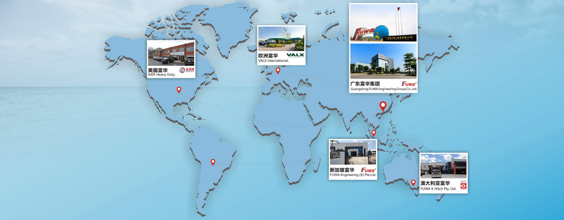 Guangdong Fuwa Engineering Group Co., Ltd. is established in 1997. It is the world’s largest trailer axle manufacturer, main products are included under-chassis equipment and components for on&off-road vehicles. We are operating our five international brands on a global scale at the same time, such as FUWA (China and Asia), VALX (Europe), AXN (NorthAmerica), K-Hitch (Australia), AMPRO (South America). The total area is more than 2.5 million sq. meters. Includes 11 subsidiary factories (4 of them abroad), 2 container ports and 1 Sino-German joint venture.